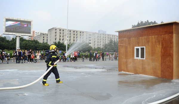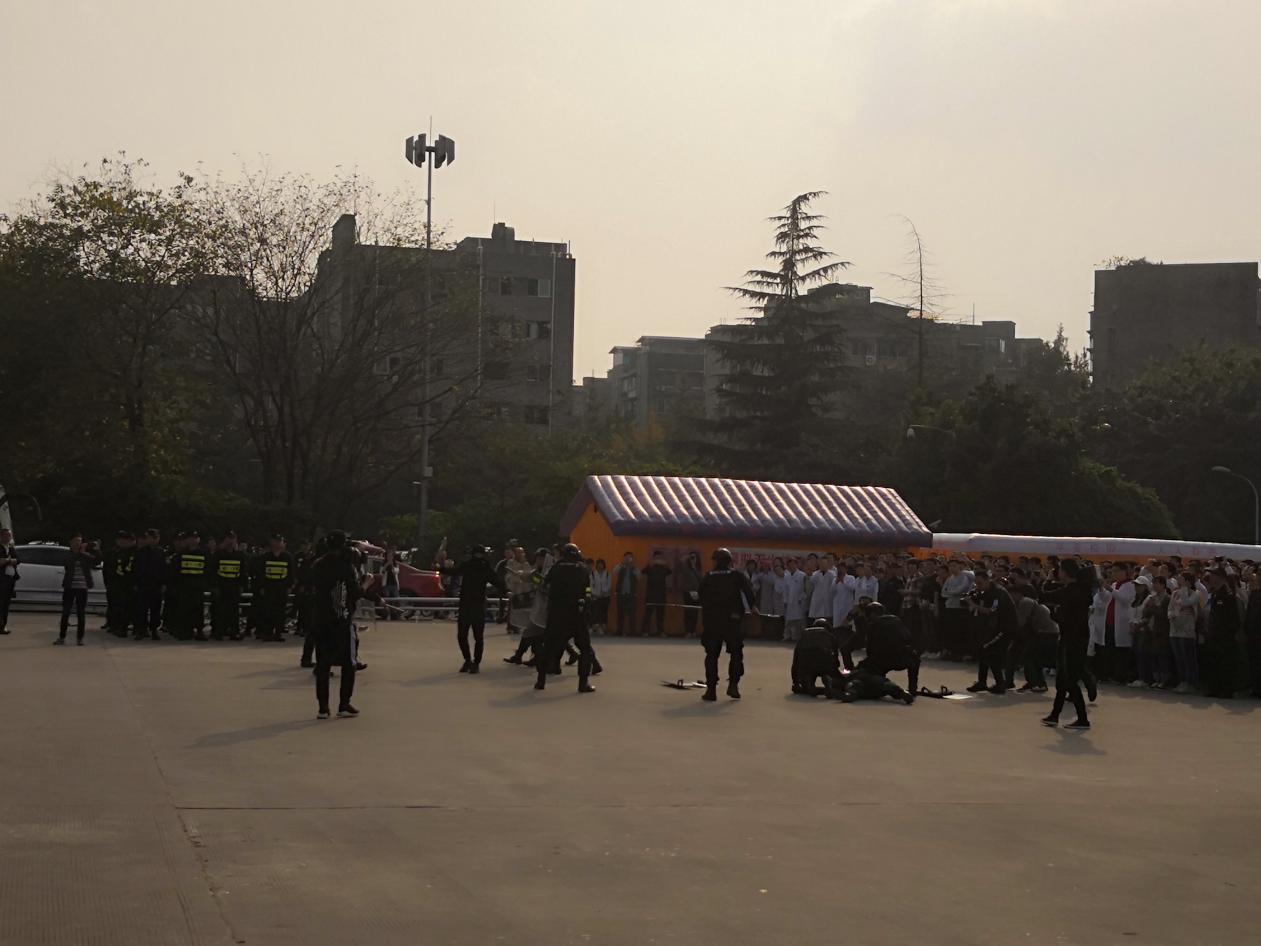 本次校园安全应急演练分为校园突发事件演练、实验室火灾模拟演练和模拟逃生及灭火器使用技能培训三部份。第一部分首先由36名保卫处勤务大队110巡逻队员进行警棍盾牌术的汇演,队员们以整齐划一的动作、精神饱满的表演得到了现场广大师生的热烈掌声。接着校园突发事件演练正式开始:5名放学的员工在体育中心广场被2名形迹可疑的男子尾随并砍杀,2名员工受伤倒地,在双方搏斗中,1名同学趁乱拨打了校保卫处电话,保卫处110巡逻队员、武侯区公安分局“飞鹰”突击队和校医院医护人员先后赶到现场处置,很快“歹徒”被制服,5名员工得以获救。第二部分是实验室火灾模拟演练。某实验室烟雾报警器检测到高浓度烟雾,响起刺耳的警报声,实验室人员迅速拿起灭火器进行灭火操作,随后向学校保卫处、119消防指挥中心报警。在校保卫处和成都消防支队第11中队消防官兵协力奋战下,大火被成功扑灭。此次演练,配合讲解,生动形象地呈现了校园自防自救的安全措施和求助流程。