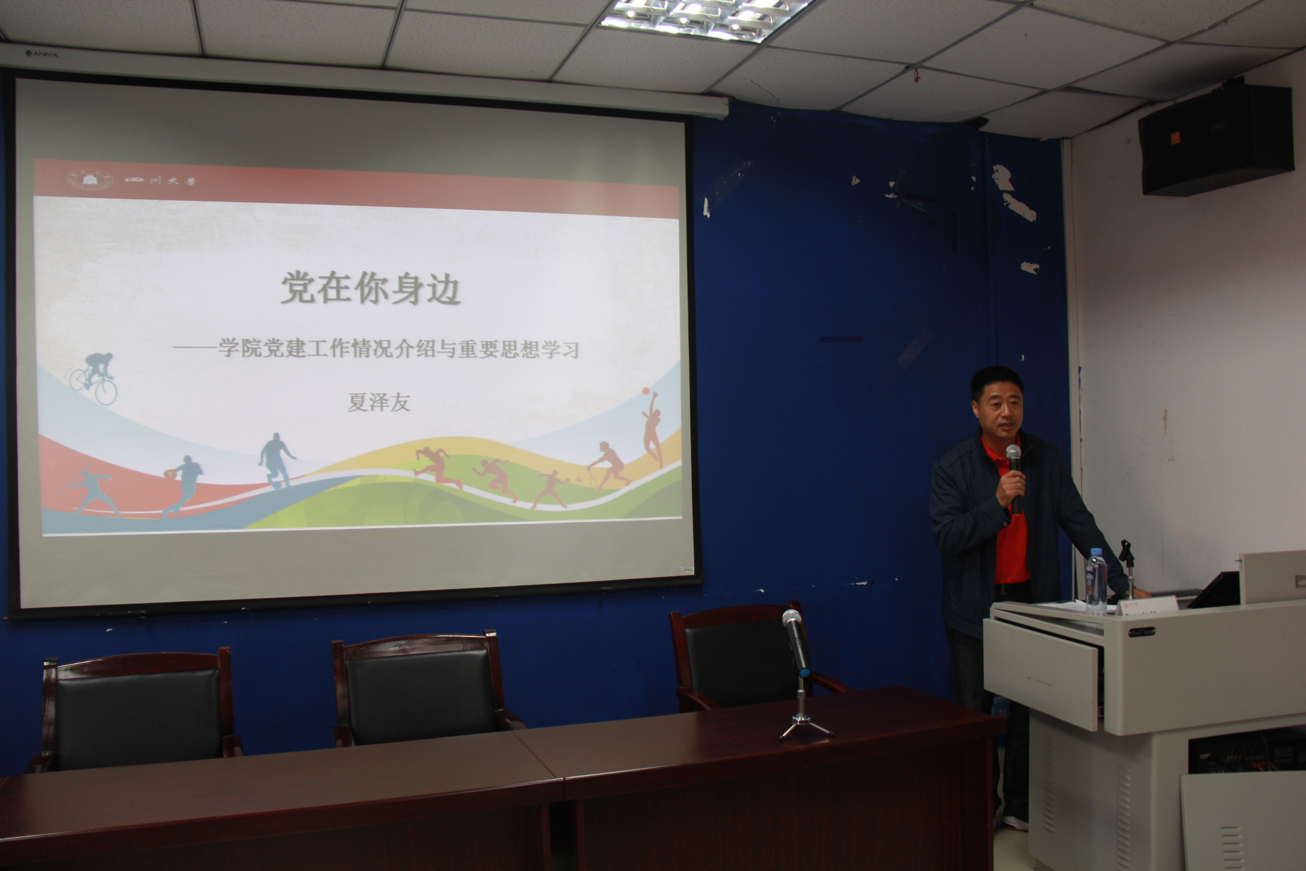 夏泽友书记首先为大家介绍了体育公司党支部的基本情况,回顾了公司党建工作的主要成绩和特色工作,同时提出了目前公司在党建工作存在的问题和改进思路,为公司党建工作进一步发展指明了方向。他结合自己的学习认识和体会,联系公司实际,强调员工深刻认识习近平总书记总要讲话的重大意义,要求员工不断提高思想水平,政治觉悟,道德品质,文化素养,成为德才兼备,全面发展的人才,为中国特色社会主义事业做贡献。