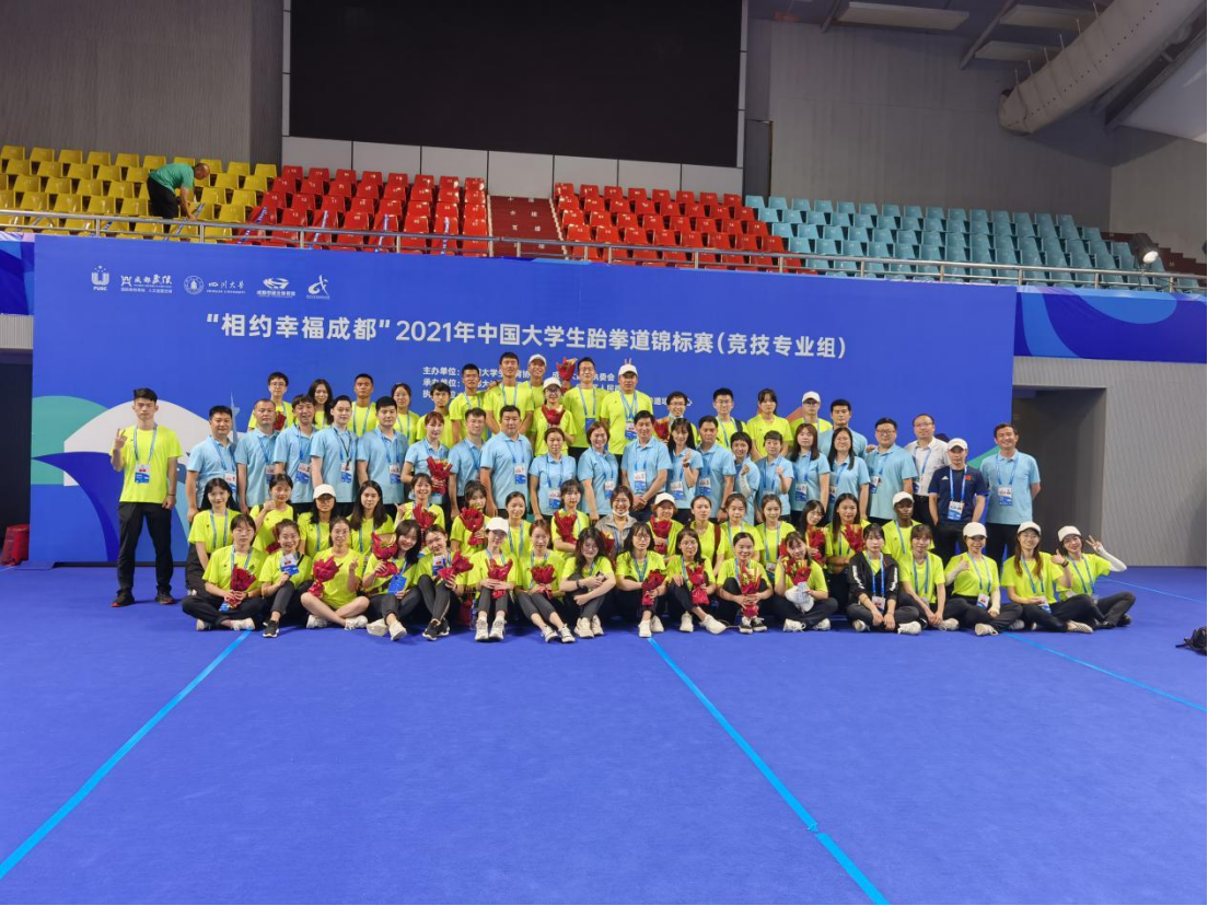 6月21日,大赛共举行了6个组别的比赛。经过两天半激烈的角逐,各代表队以全部比赛所有丙组运动员的成绩总分决出了男女团体前三名,其中男子团体冠军为中北大学、女子团体冠军为中国地质大学(北京)。比赛结束后,川大望江校区跆拳道场馆中心全体工作人员及部分志愿者进行了合影。