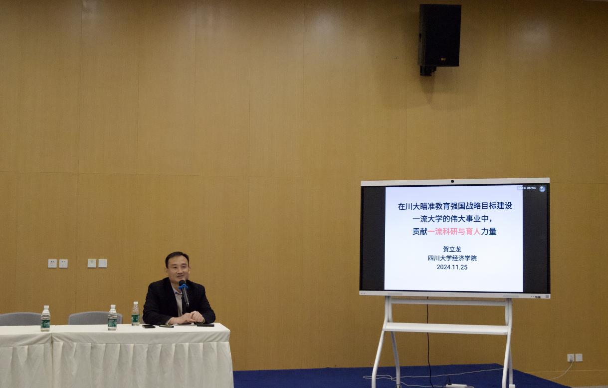 宣讲会上,贺立龙教授深度剖析了两大重要会议精神与教育领域的紧密关联与深远影响。他从纷繁复杂的国际国内形势、新一轮科技革命和产业变革、人民群众对全体人民共同富裕的新期待、国家最新经济政策等方面出发,对党的二十届三中全会、全国教育大会中关于深化教育综合改革、深化人才发展体制机制等新要求作了细致的解读。他强调到,教育在国家发展中具有基础性、先导性和全局性作用,教育改革必须坚持以人民为中心的发展理念,加强教育信息化建设,利用现代技术手段提高教学效率和质量,致力于推动教育公平,提升教育质量。