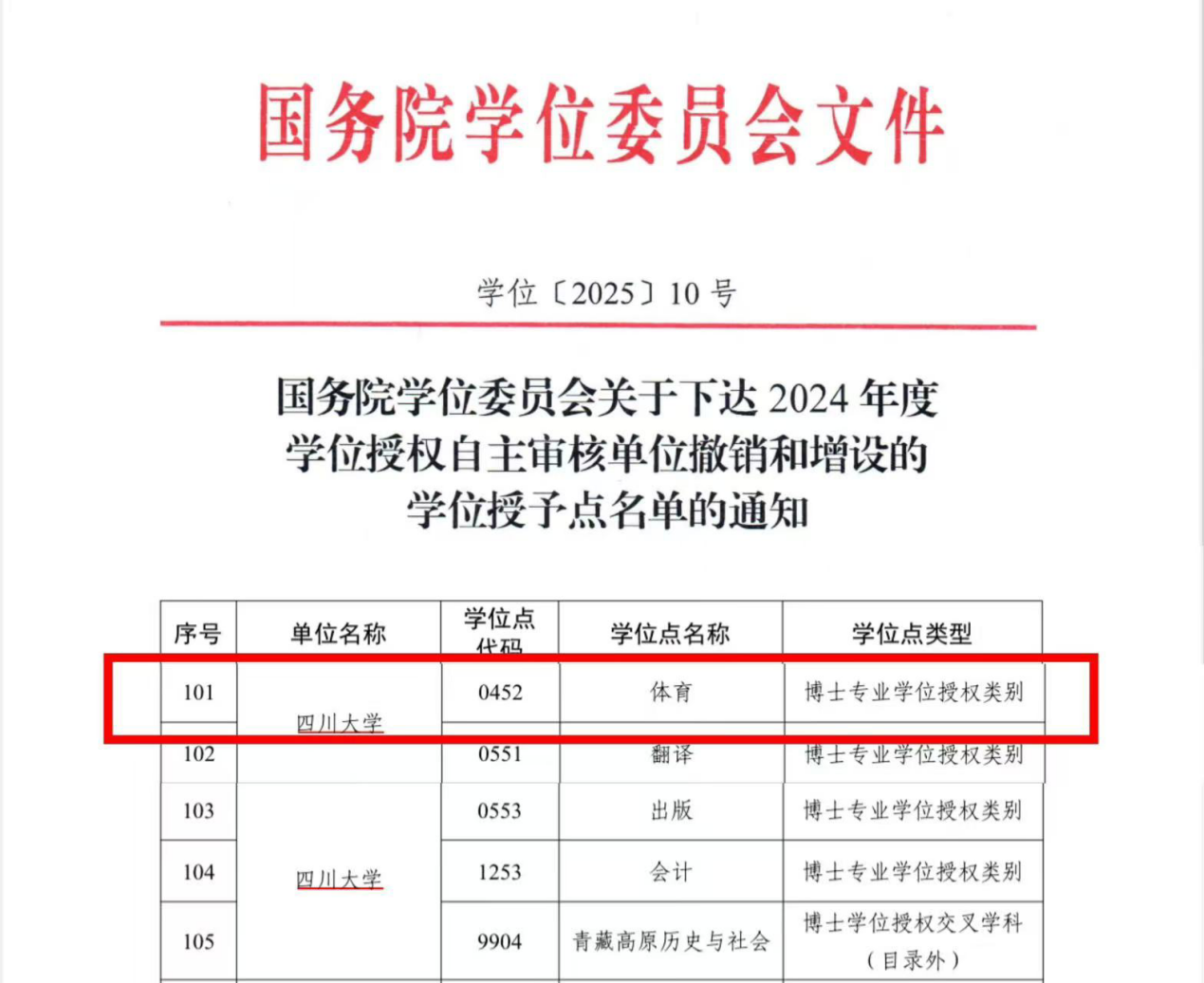 根据国务院学位委员会近日发布的《国务院学位委员会关于下达2024年度学位授权自主审核单位撤销和增设的学位授予点名单的通知》,公海gh555000aa线路检测自主审核增设的“体育”博士专业学位授予点正式获得批准。