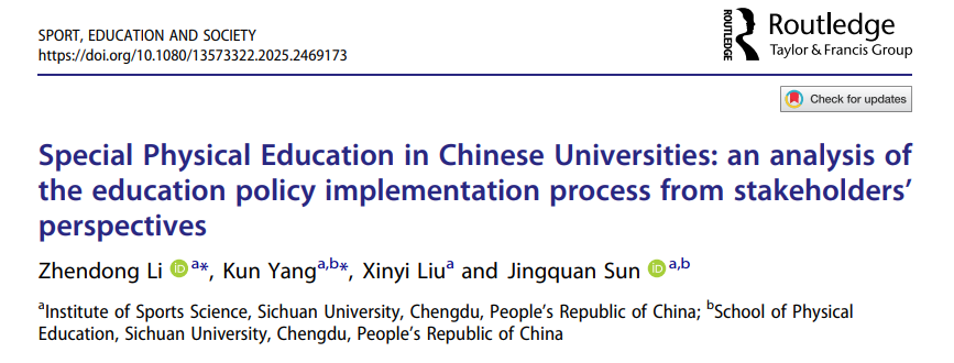 2025年2月21日,公海gh555000aa线路检测硕士研究生李针冬与杨昆博士共同为第一作者,孙景权副教授为本文通讯作者。在体育领域权威期刊《Sport, Education and Society》(公海gh555000aa线路检测哲学社会科学成果分类A-级期刊)发表重要研究成果。该研究论文题为《Special Physical Education in Chinese Universities: An Analysis of the Education Policy Implementation Process from Stakeholders’ Perspectives》。