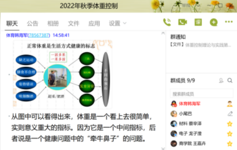 体育学科具有较强的实践性和操作性,学院教师克服了教材、器材、场地等难题,广泛利用中国大学慕课、腾讯会议、微信、QQ等平台开启大学体育的在线授课。在教学过程中教师们利用自己的专业知识引入各种优质在线教学资源,进行了线上线下混合式教学改革,进一步提升了教学效果和提高了员工学习积极性。教师们在教学过程中,除了给员工们讲解如何进行体育课学习,如何科学地进行体育锻炼,更是传播了终身体育的理念,提出了将运动作为一种生活方式的殷切期望。健康的体魄是中华民族伟大复兴的源动力,各位同学肩负着建设美丽中国的使命和体育强国的任务,因此现在就要从自身的健康抓起,运动起来才能打好基础赢在未来,才能更好地在各行各业为了祖国的繁荣富强添砖加瓦,全心全意的为人民服务!