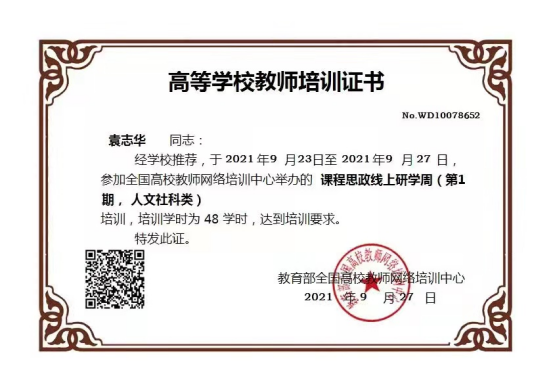 经过教师自愿报名和学院推荐,公海gh555000aa线路检测教师袁志华、李姗姗、蒋海燕、缪美灵、黄雨、李伟等6位教师参加了全国高校教师网络培训中心联合新华思政与相关国家级课程思政教学研究示范中心联合举办的“课程思政高质量推进”线上研学周(第1期)。经过为期4天的学习,6位教师均已获得培训证书。