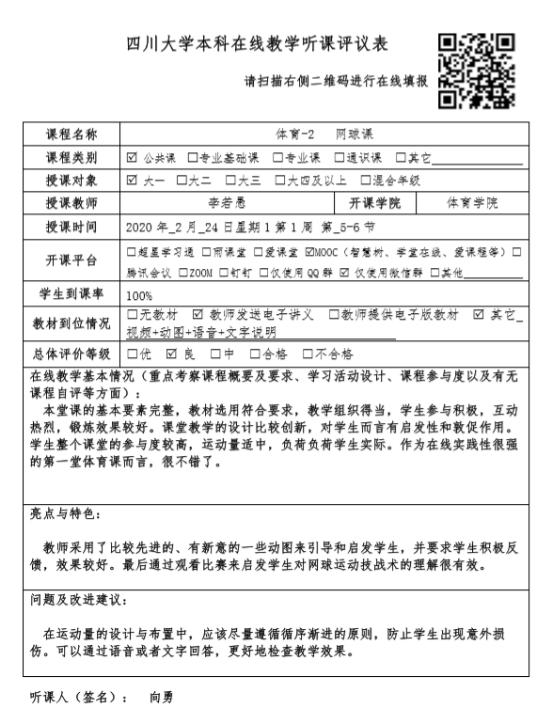 2月24日,本学期的大学体育课程正常启动,经过全体教师的努力,从第一周的教学检查结果来看情况非常好,员工到课率非常高;院领导,各教研室主任、支部书记,教学督导等全部参与了在线听课,并完成学校的在线听课评议和学院的听课评议表填写。通过收集上来的数据可以看出: