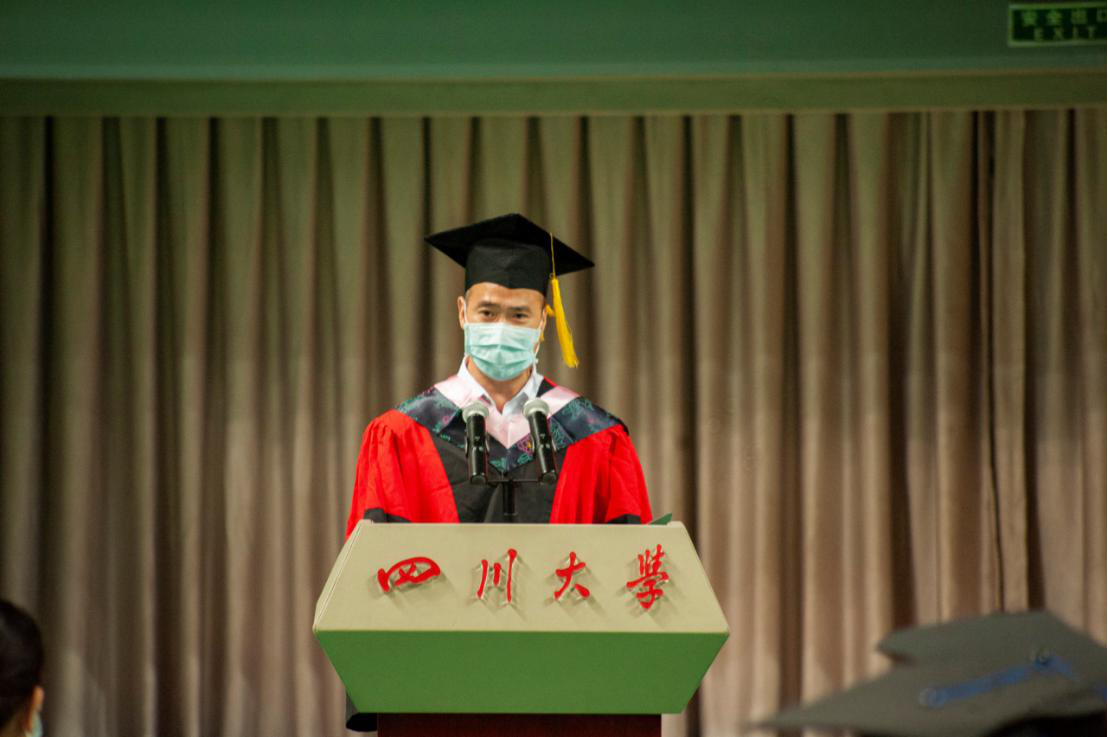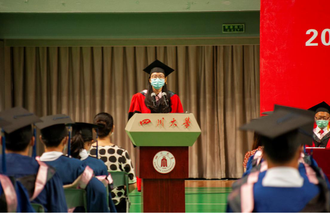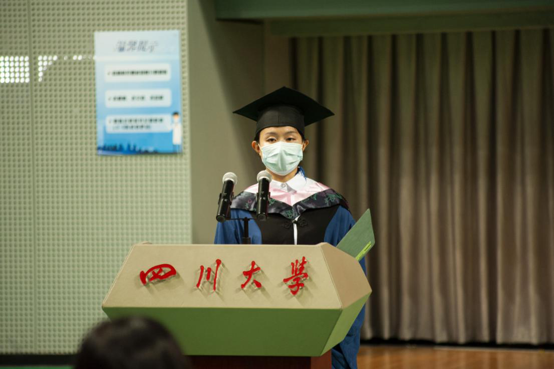 毕业生代表梁琼向母校、学院领导、老师们表达了诚挚的感谢和崇高的敬意。感谢老师们无微不至的关怀和敦敦教诲,梁琼同学分享了从看文献、写文献综述、到写出毕业论文经历的苦与甜。对学校表达了感恩,对老师表达了感谢,对同学表达了祝福,对未来表达了期许。