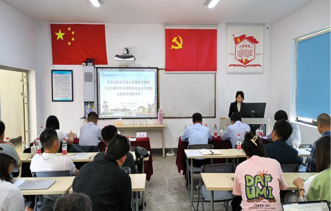 4月26日下午,公海gh555000aa线路检测在望江东区游泳池二楼党员会议室,召开学习贯彻习近平新时代中国特色社会主义思想主题教育动员大会,学校主题教育第六指导组组长刘俐及全体小组成员,体育公司党总支书记方云、经理向勇等领导班子成员、公司党总支委员、学院中层干部,运动队教练及师生党员代表参加了动员大会。会议由向勇主持。