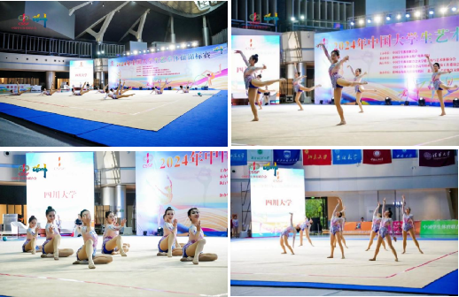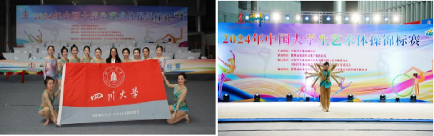 本次参赛的代表队成员分别来自艺术学院、生物医学工程学院、华西口腔医学院、华西药学院、华西临床医学院、经济学院、数学学院和商学院,均在大学期间才接触艺术体操。川大艺术体操队每周进行两次常规训练以及赛前平均每周10个小时集训加练,在教练谭月华老师、龙小雨老师的悉心指导下,队员们的身体姿态、器械能力和柔韧度等方面都取得了巨大进步。在此次全国锦标赛中,代表队成员赛出了风格与水平,克服紧张的心理情绪与身体的新伤旧疾,不仅出色地完成了六米抛接、鹿跳结环、大跨跳加后屈半劈腿跳等难度动作,还优美地呈现了波浪、旋转、摆动等艺术动作,集柔美感与力量感于一身。特别是一套以龙为主题的自选集体操,运用优雅的艺术体操动作演绎龙腾四海的威武之姿,通过精心编排的队形变化和翩若惊鸿宛若游龙的舞姿,营造出龙的灵动与威严,以高分15.999的绝对优势斩获冠军,在国家级体育赛场上尽数展现川大学子的精神风貌。